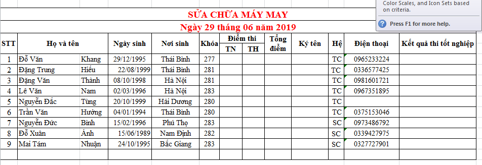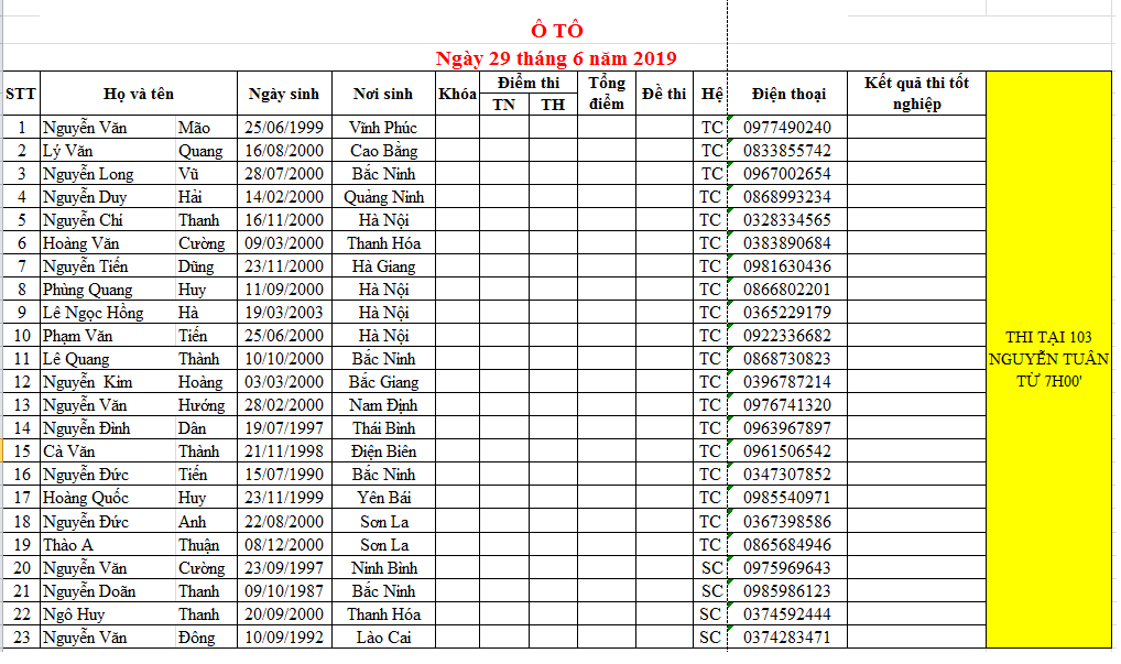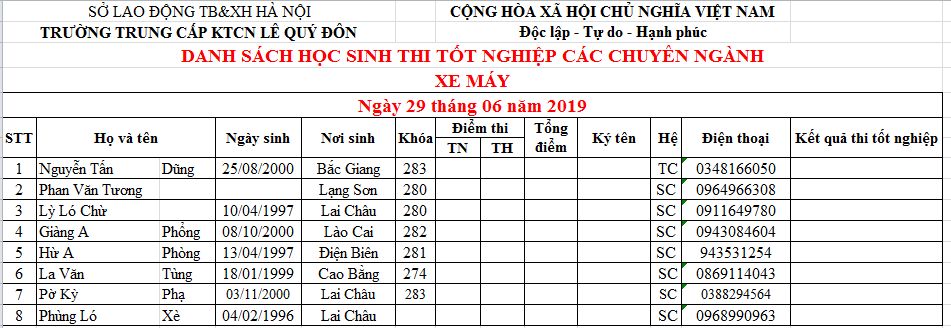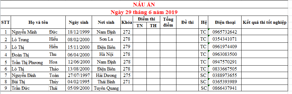 DANH SÁCH HỌC VIÊN THI CÁC MÔN CHUYÊN NGÀNH THÁNG 06/2019