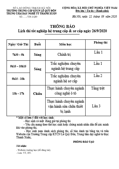 Lịch thi tốt nghiệp hệ trung cấp và sơ cấp ngày 26/09/2020