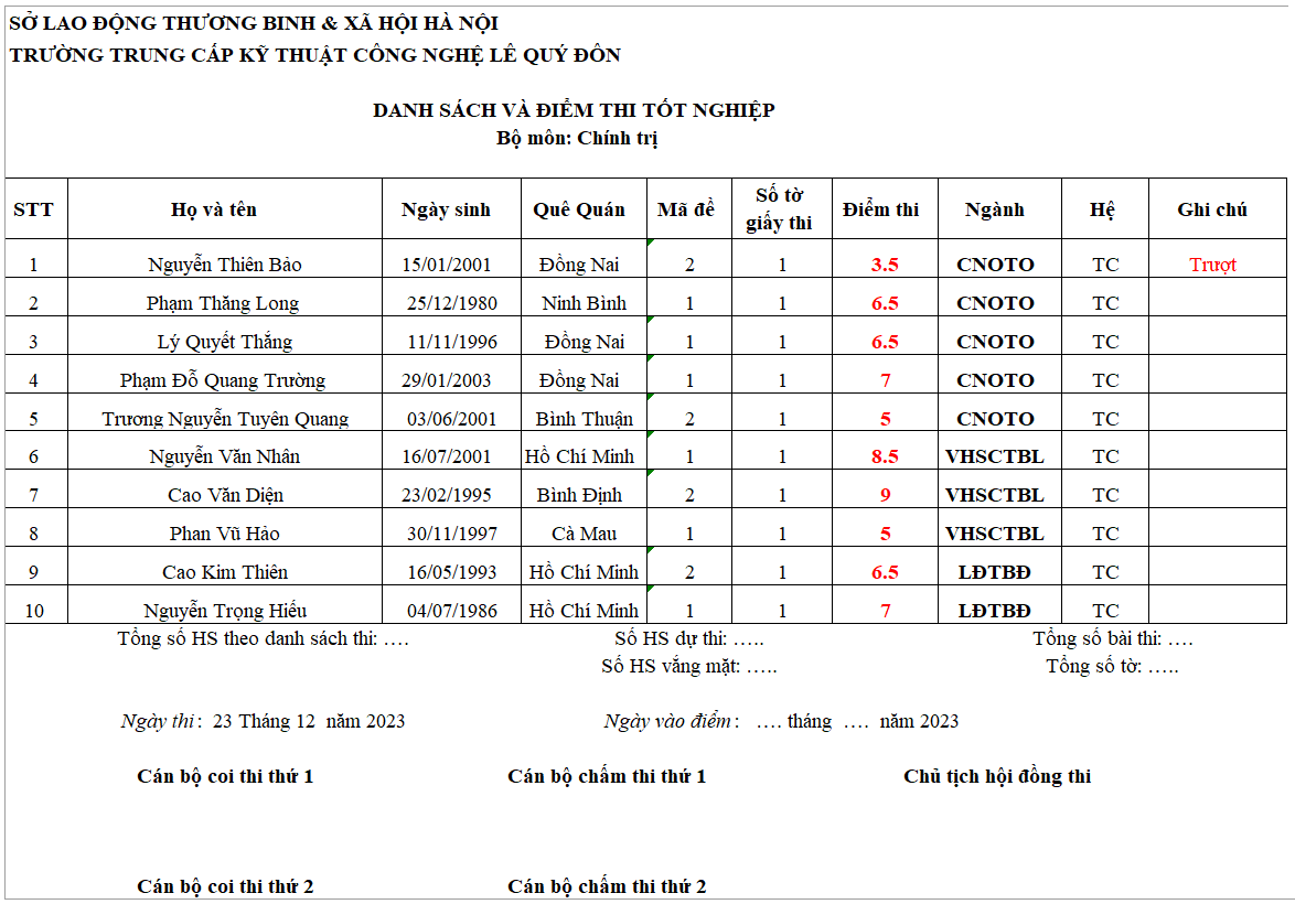 THÔNG BÁO ĐIỂM THI CHÍNH TRỊ THÁNG 12/2023