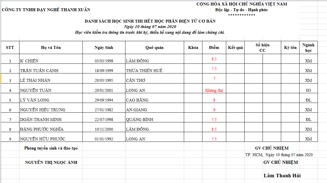 THÔNG BÁO ĐIỂM THI ĐIỆN CƠ BẢN NGÀY 10.07.2020