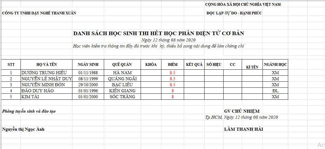 THÔNG BÁO ĐIỂM THI ĐIỆN CƠ BẢN NGÀY 12/08/2020