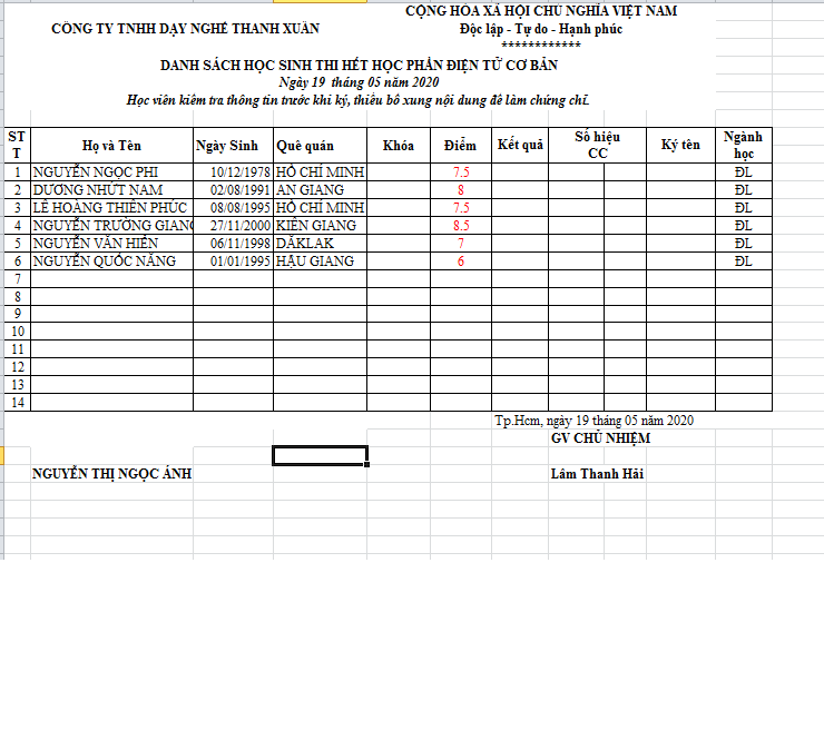 THÔNG BÁO ĐIỂM THI ĐIỆN CƠ BẢN NGÀY 19.05.2020