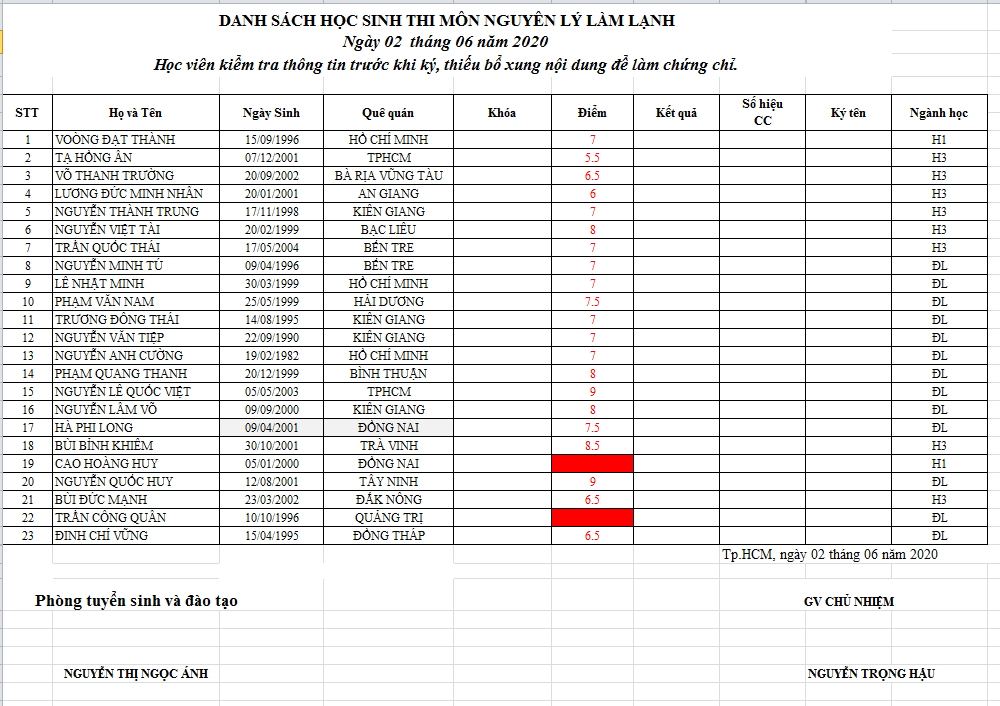 THÔNG BÁO ĐIỂM THI MÔN NGUYÊN LÝ LÀM LẠNH  NGÀY 02.06.2020