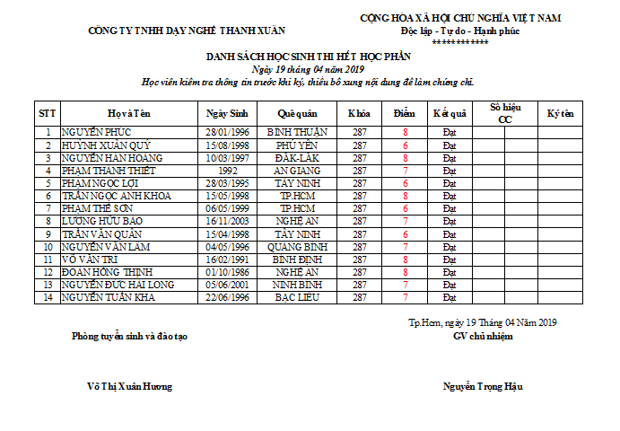 THÔNG BÁO ĐIỂM THI MÔN NGUYÊN LÝ LẠNH CƠ BẢN NGÀY 19-04-2019
