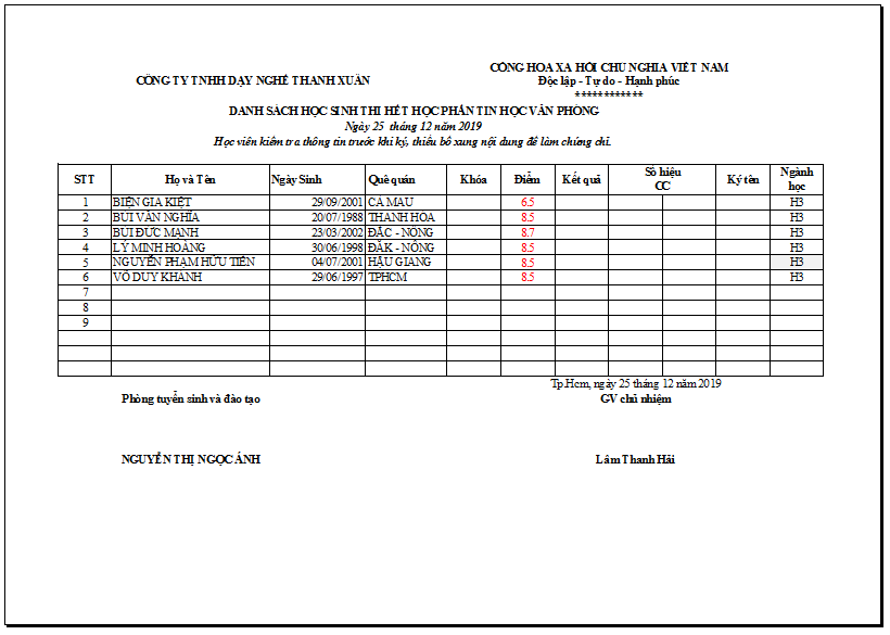THÔNG BÁO ĐIỂM THI TIN HỌC VĂN PHÒNG NGÀY 25/12/2019