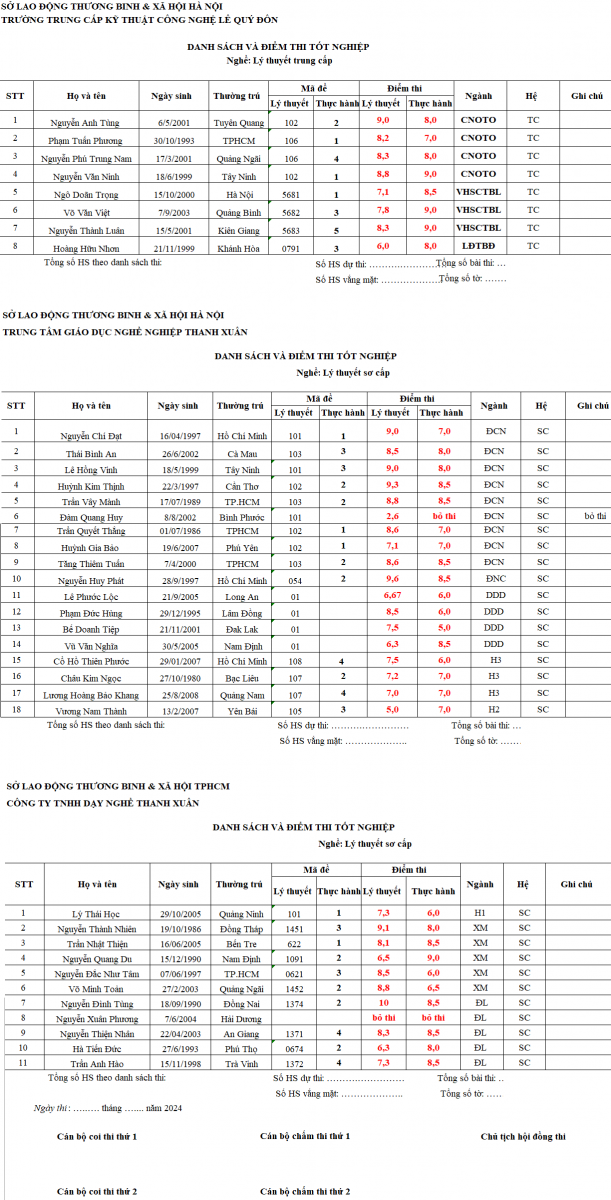 THÔNG BÁO ĐIỂM THI TỐT NGHIỆP LÝ THUYẾT VÀ THỰC HÀNH THÁNG 06/2024