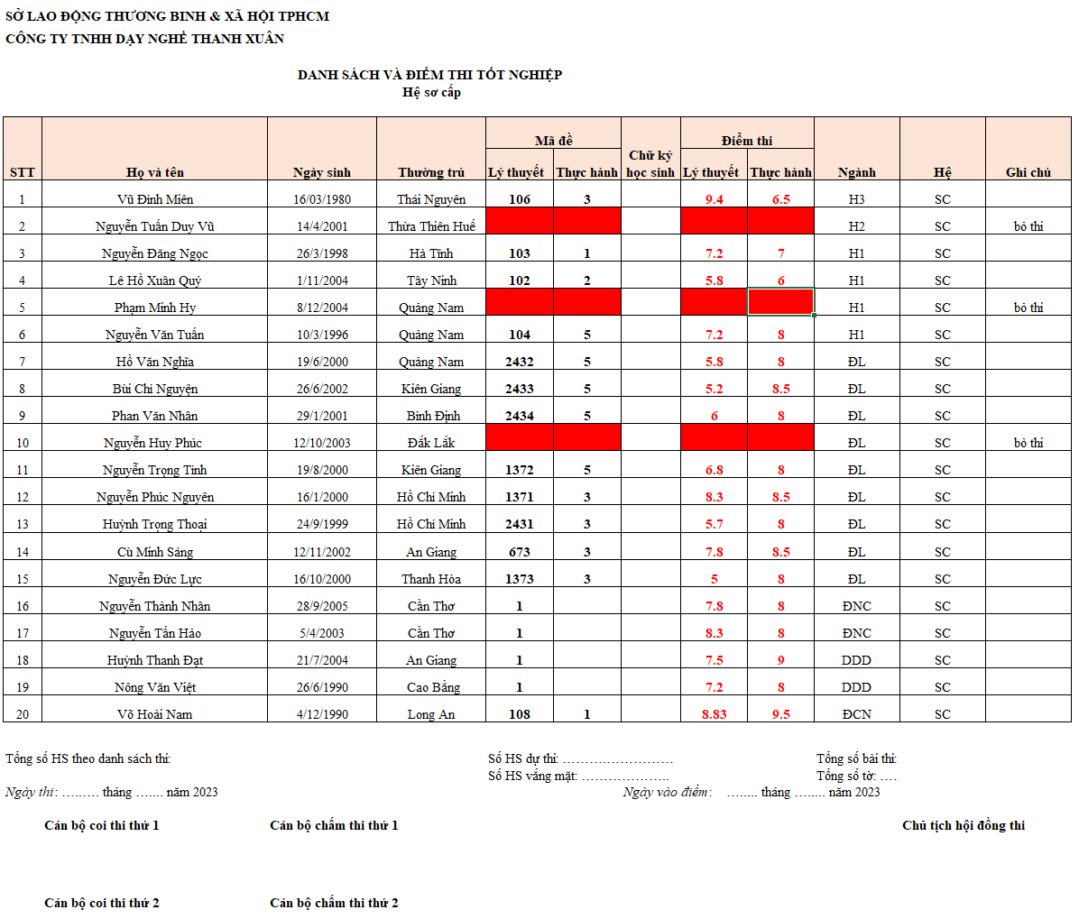 THÔNG BÁO ĐIỂM THI TỐT NGHIỆP LÝ THUYẾT VÀ THỰC HÀNH THÁNG 9/2023