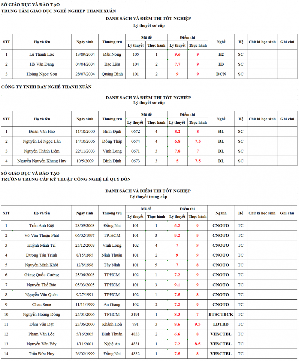 THÔNG BÁO ĐIÊM THI TỐT NGHIỆP LÝ THUYẾT VÀ THỰC HÀNH THÁNG 9/2025