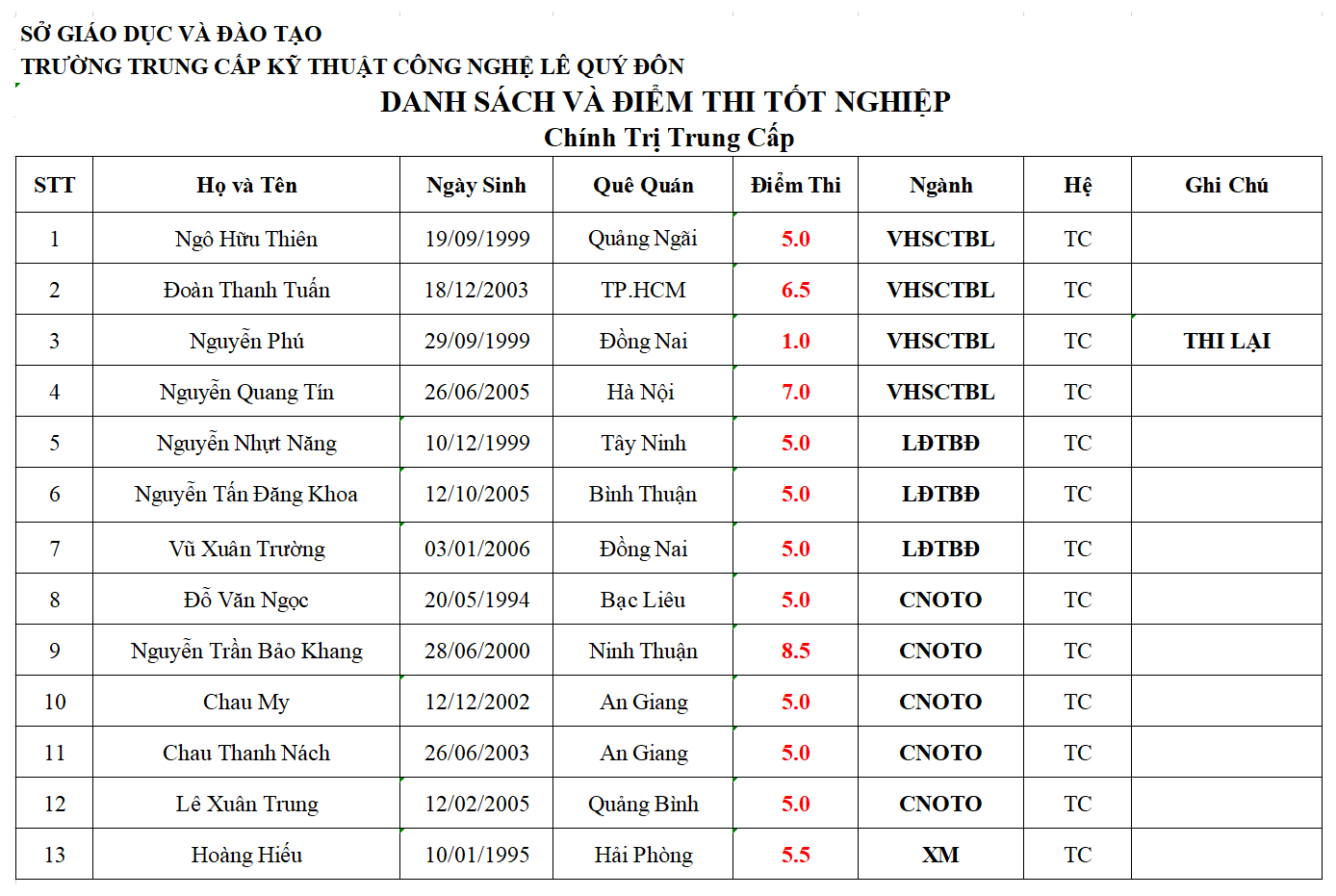 THÔNG BÁO ĐIÊM THI TỐT NGHIỆP MÔN CHÍNH TRỊ THÁNG 03/2026