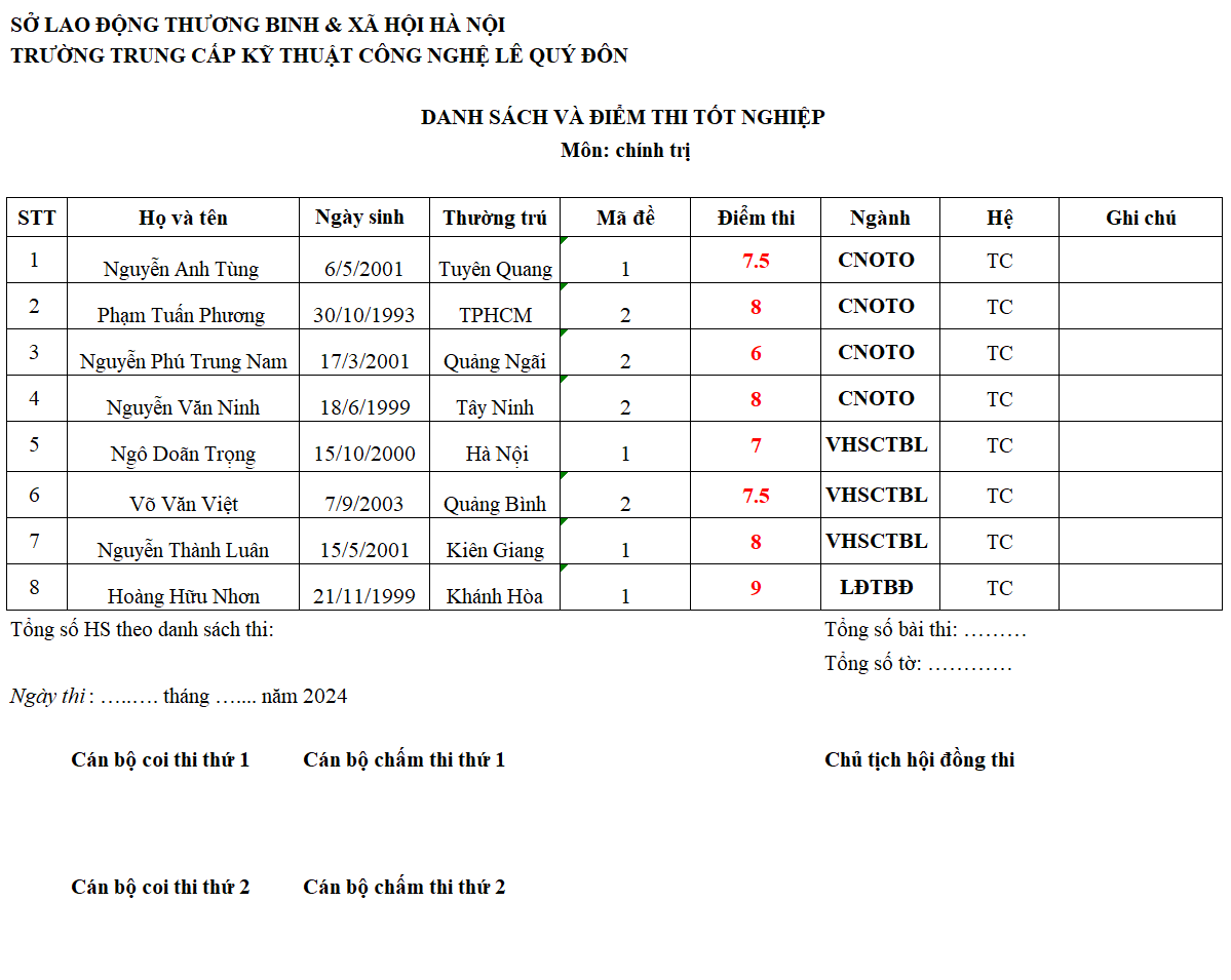THÔNG BÁO ĐIỂM THI TỐT NGHIỆP - MÔN CHÍNH TRỊ THÁNG 6/2024