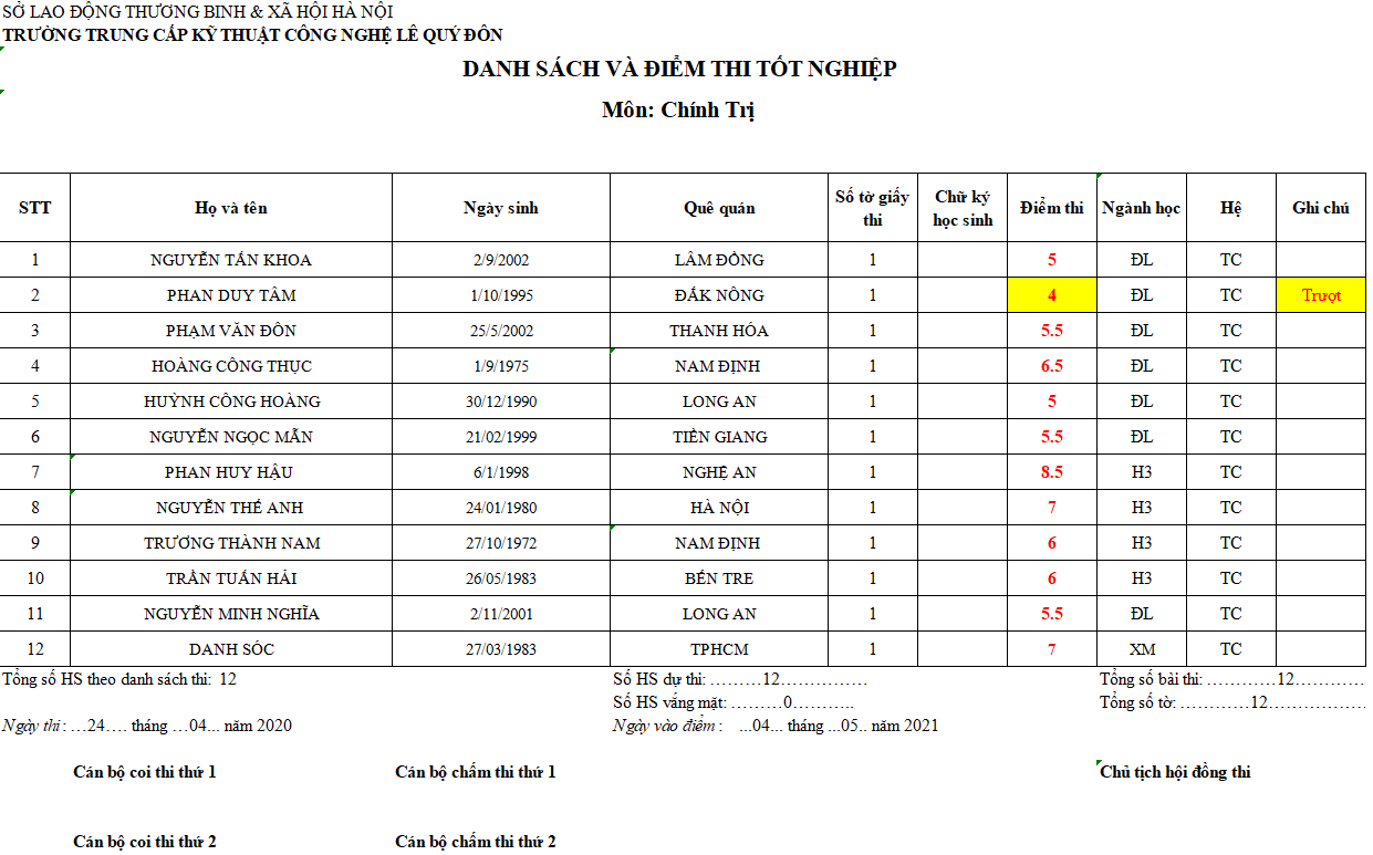 THÔNG BÁO ĐIỂM THI TỐT NGHIỆP MÔN CHÍNH TRỊ NGÀY 24/04/2021