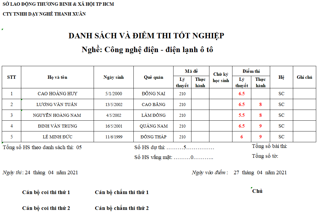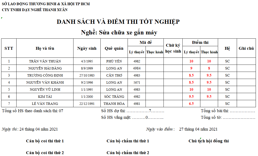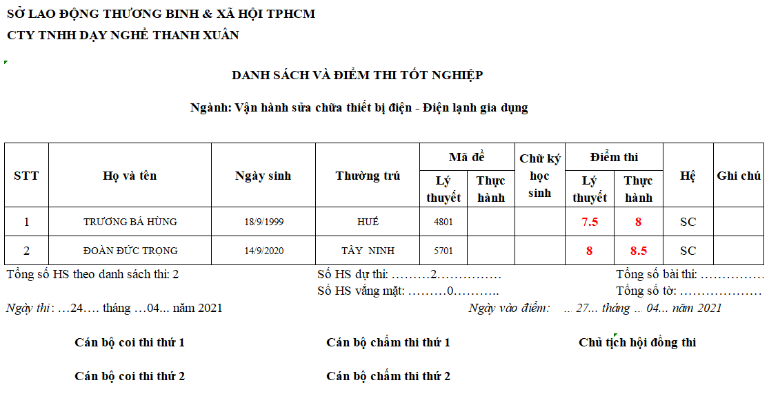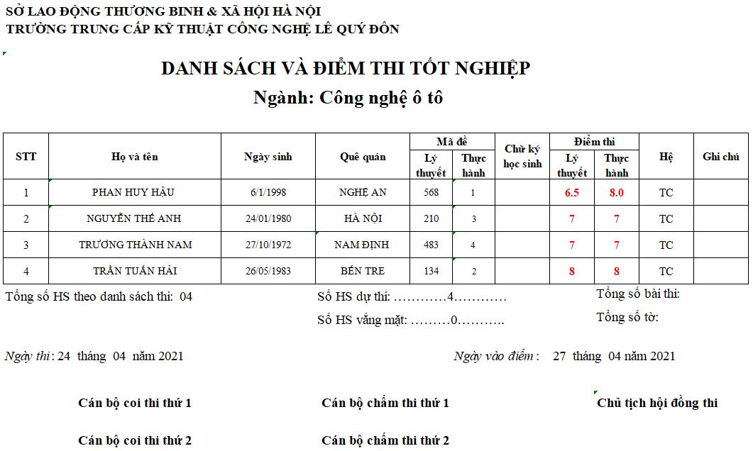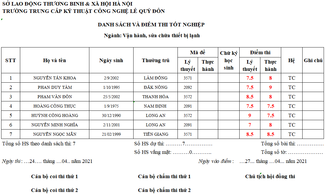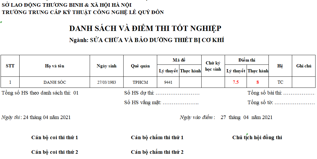 THÔNG BÁO KẾT QUẢ THI TỐT NGHIỆP NGÀY 24/04/2021 VÀ NGÀY 25/04/2021