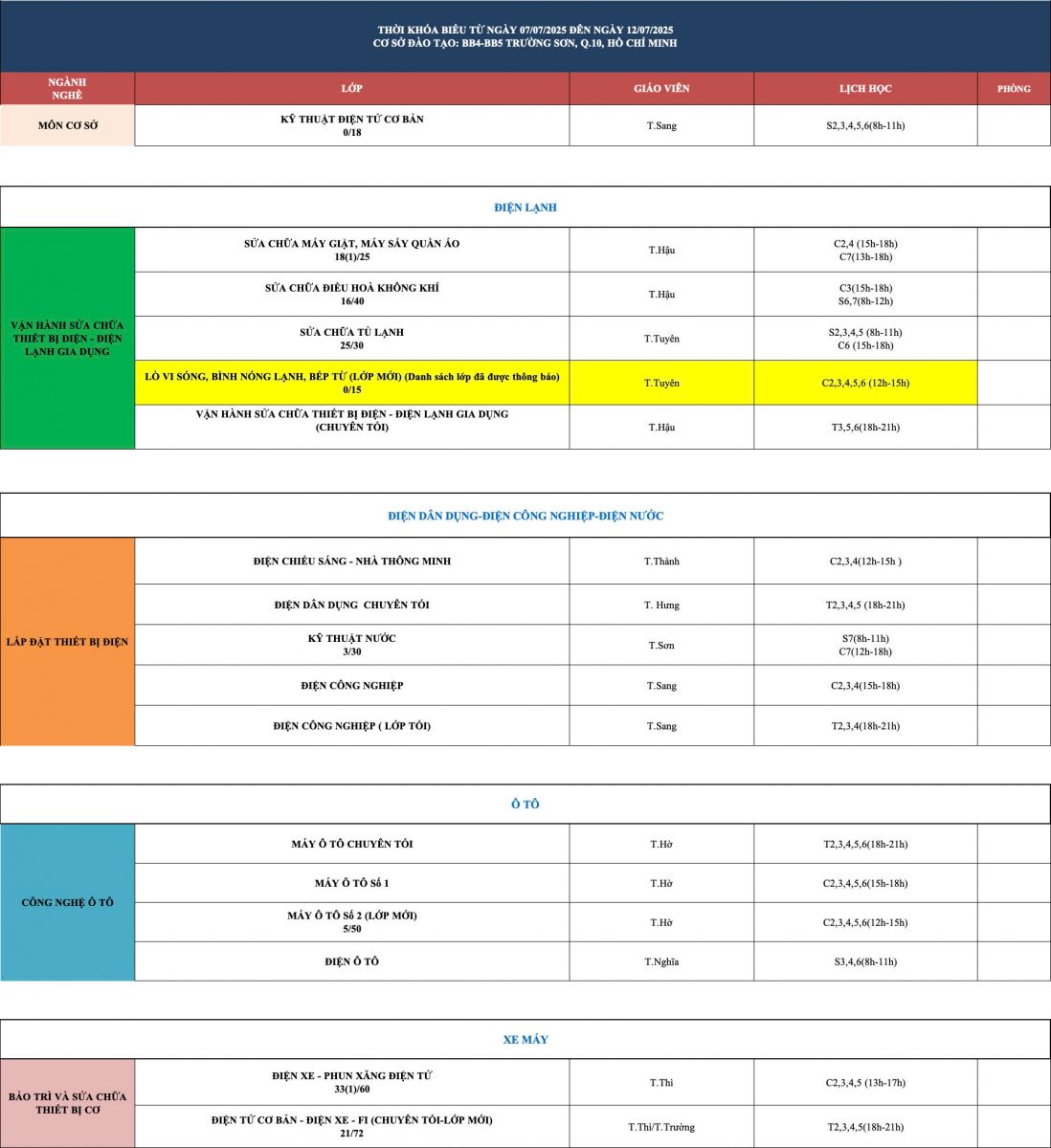 THÔNG BÁO LỊCH HỌC TUẦN MỚI TỪ NGÀY 07/07/2025 ĐẾN NGÀY 12/07/2025