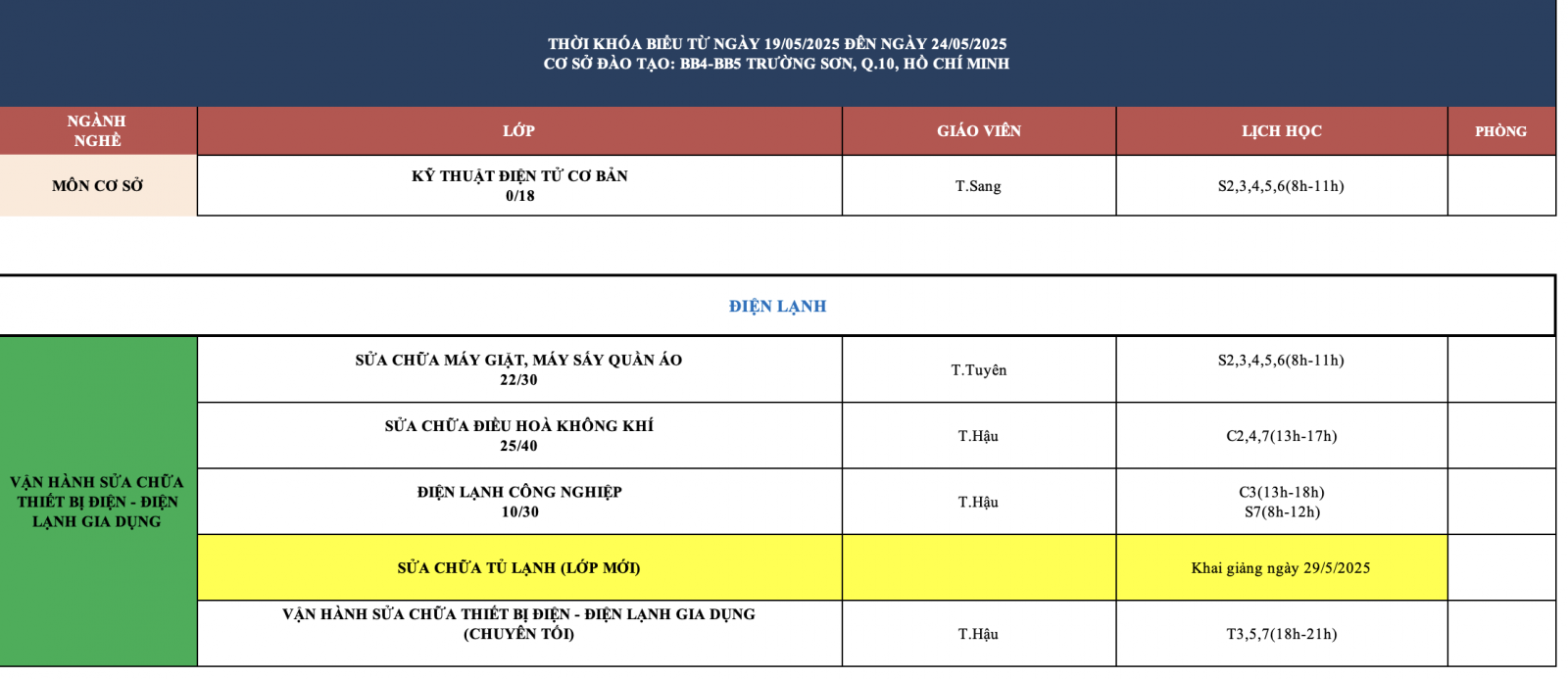 THÔNG BÁO LỊCH HỌC TUẦN MỚI TỪ NGÀY 19/05/2025 ĐẾN NGÀY 24/05/2025