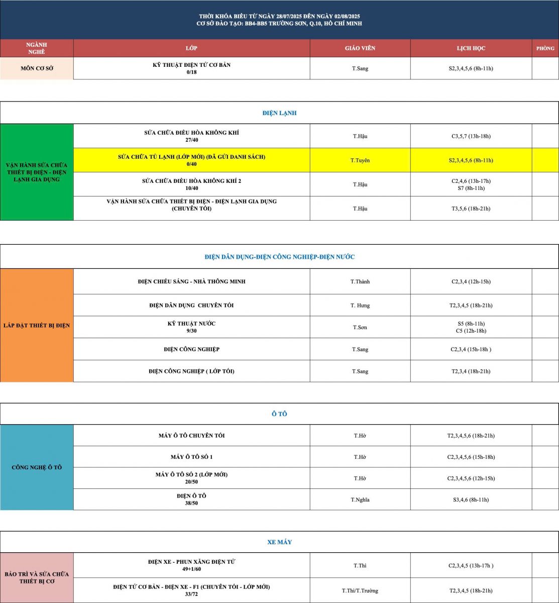 Lớp mới: Công nghệ ô tô: MÁY Ô TÔ Xe máy: ĐIỆN XE - FI - MÁY ĐỌC LỖI Điện lạnh: LVS - BNL - BT