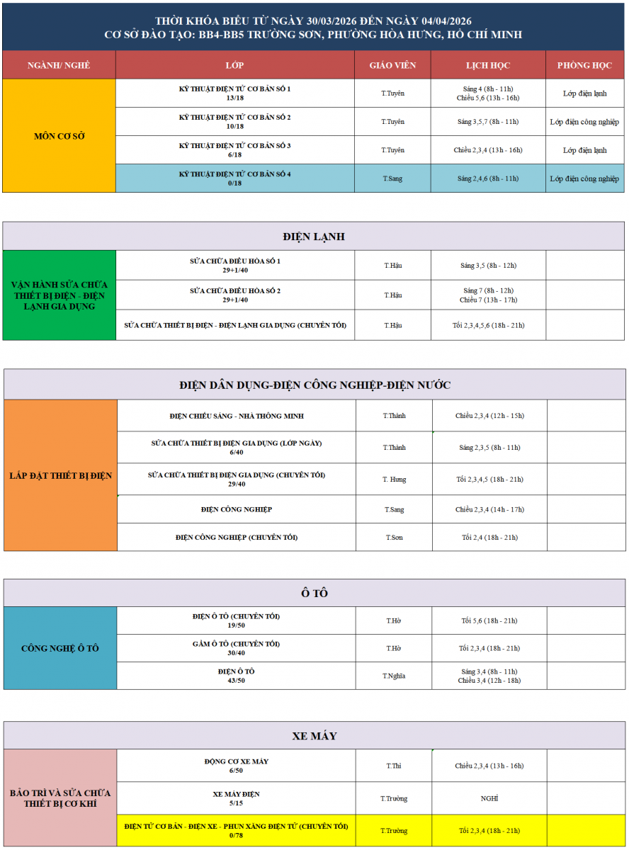 THÔNG BÁO LỊCH HỌC TUẦN MỚI TỪ NGÀY 30/03/2026 ĐẾN NGÀY 04/04/2026