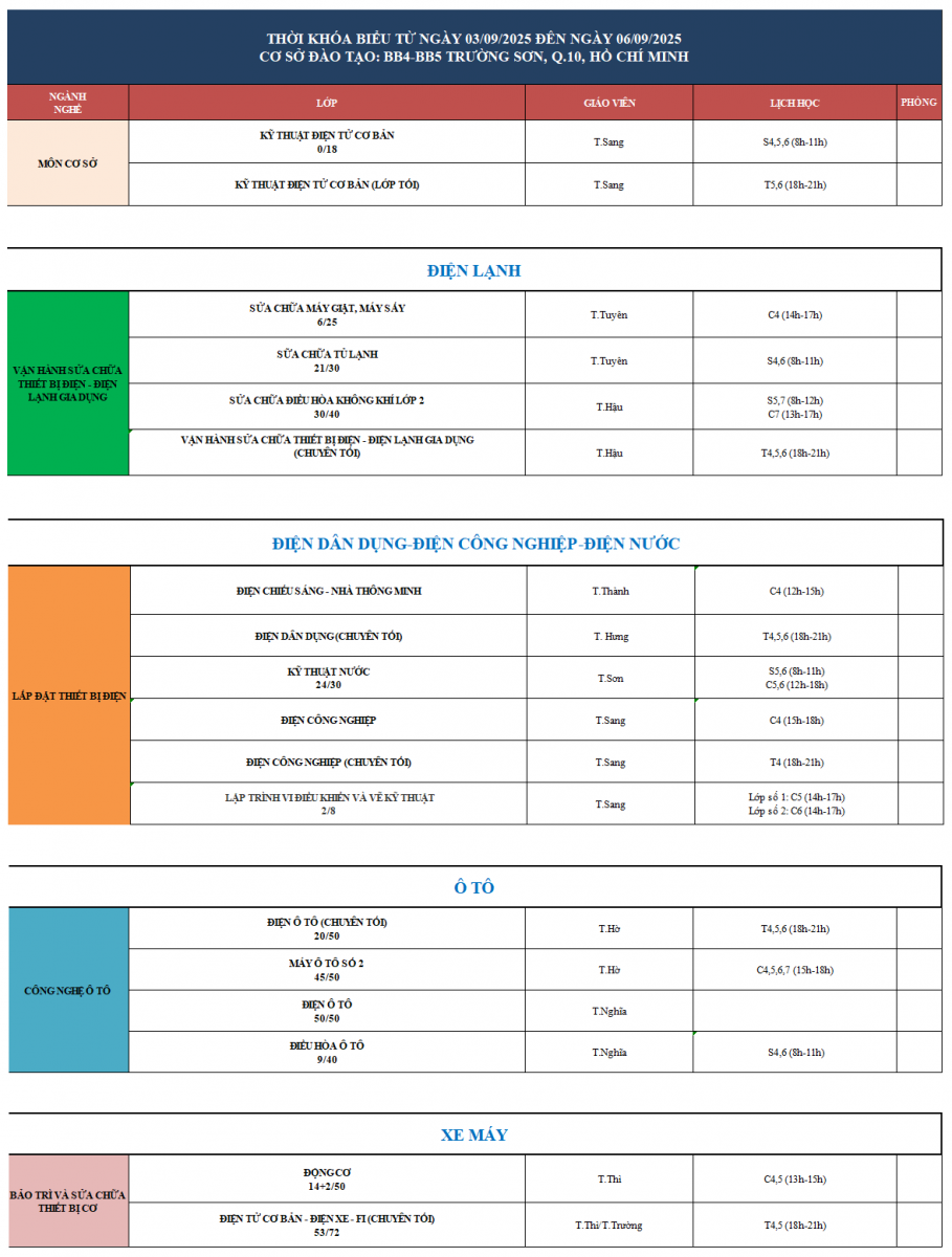 THÔNG BÁO LỊCH HỌC TUẦN MỚI TỪ NGÀY 3/9/2025 ĐẾN NGÀY 6/9/2025