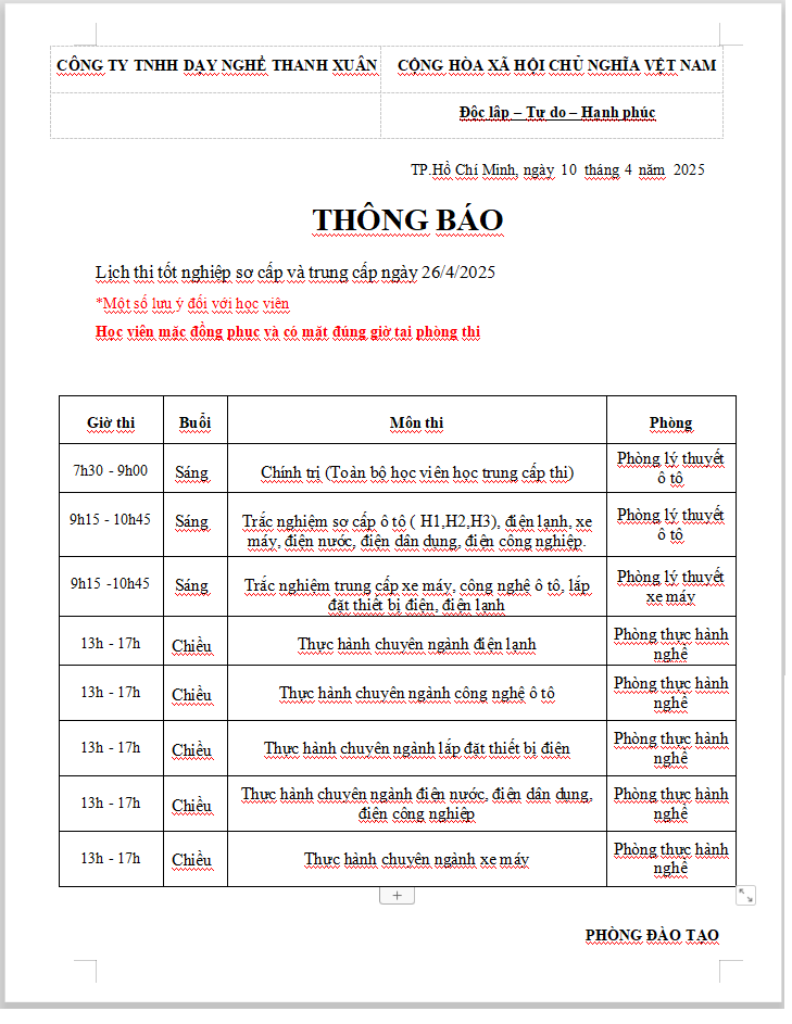 TRUNG TÂM DẠY NGHỀ THANH XUÂN THÔNG BÁO DANH SÁCH THI TỐT NGHIỆP THÁNG 10/2019 tại TPHCM Thời gian thi: từ 13h00 đến 17h00, thứ 7 ngày 26/10/2019 tại cơ sở 2: 99 Thành Thái - Q10 - TPHCM Thí sinh có mặt trước giờ thi 30 phút để làm thủ tục phòng thi Yêu cầu thí sinh có mặt tại phòng thi đúng giờ, mặc đồng phục đầy đủ, Thí sinh có tên trong danh sách nếu không đến dự thi hoặc đến muộn sẽ bị tính bỏ thi, không được công nhận kết quả tốt nghiệp