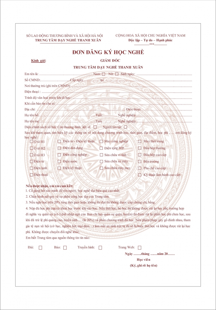 1. Đơn đăng kí học nghề (mẫu sẵn có tại trung tâm)